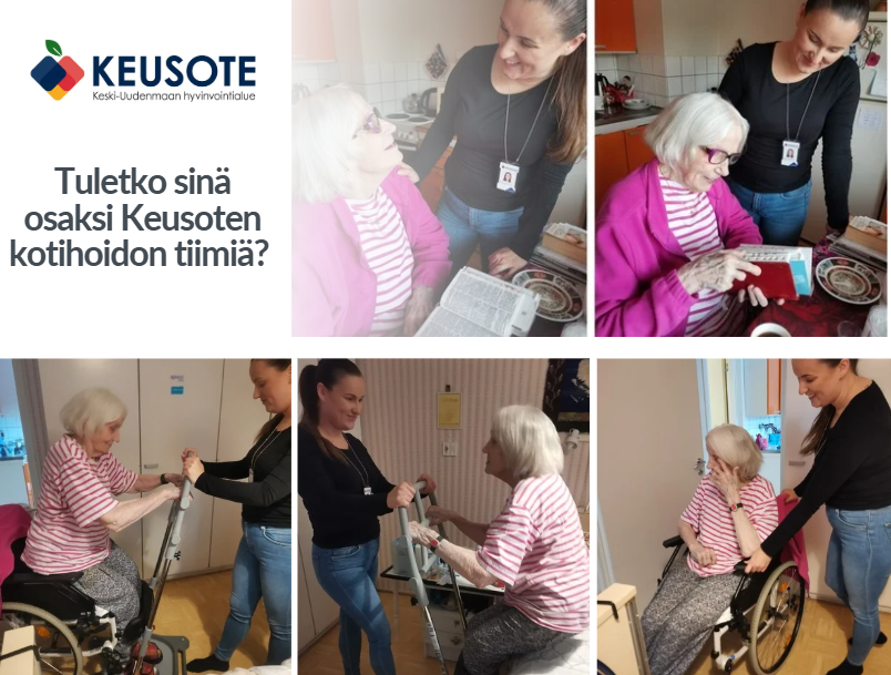 Lisätiedot tehtävästä antaa kotihoidon esihenkilö, Pia Mehtonen, p. 050 497 1700, pia.mehtonen@keusote.fi.